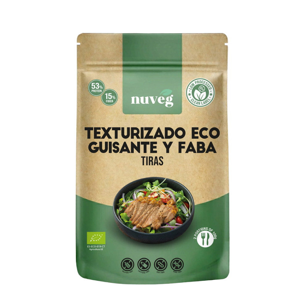 El texturizado proviene de guisante y faba cultivada en la UE. No contiene soja.